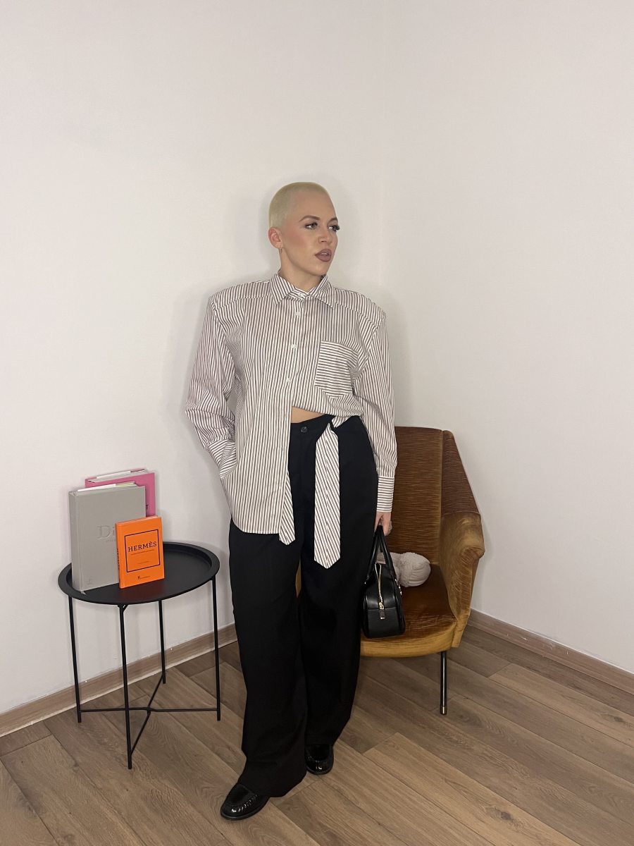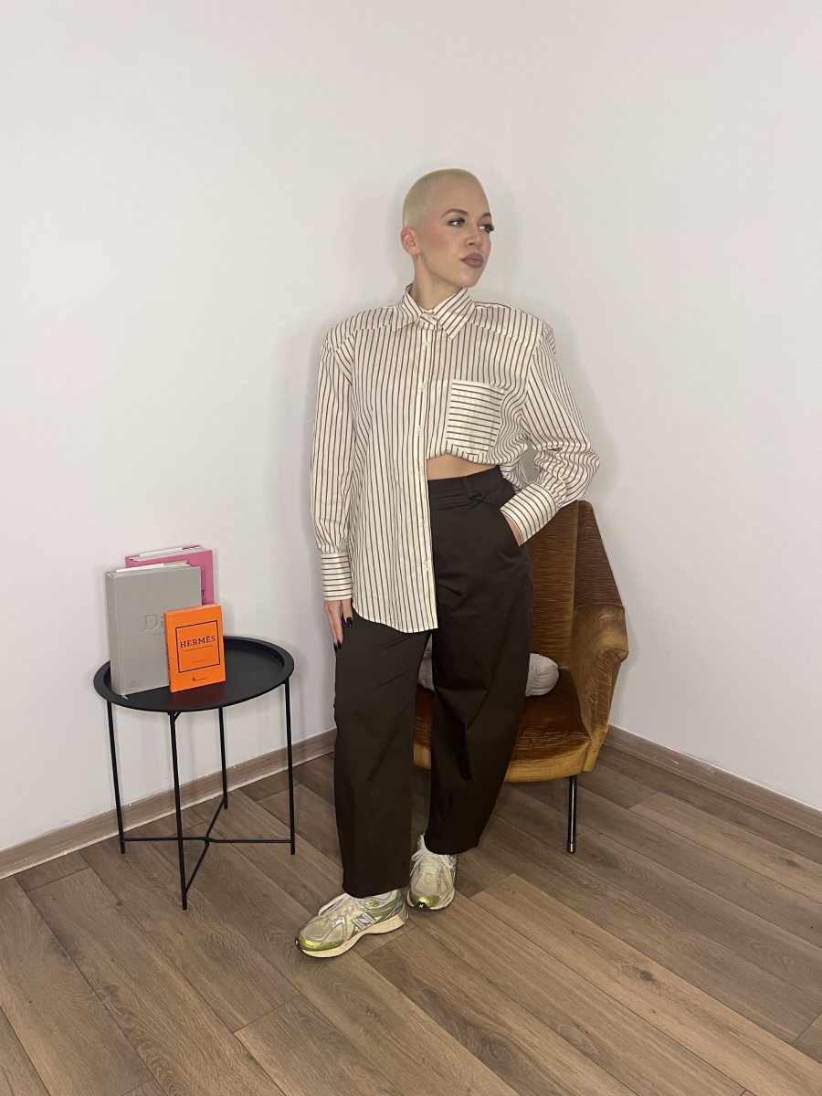 Camicia con spalline e righe verticali, veste leggermente over.